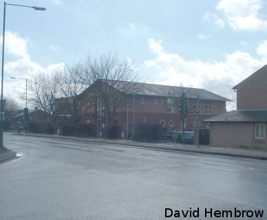 The crossing of Arbury Road near St. Albans Road and St. Lawrence's school showing the path leading past the school grounds towards King's Hedges. We can ride from this position to the Science Park hardly having to touch any roads at all (you can see the whole route described here). At this point, the path has a newer housing development on the right, which presents a fence against the path instead of including equally good cycling or walking provision. The squat building on the left in the second photo is a children's swimming pool.