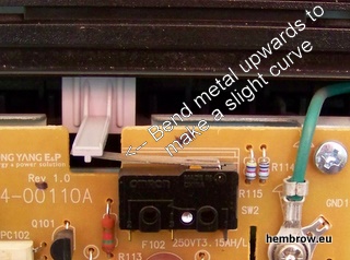 Note that this is a safety critical switch. It removes a high voltage supply to the heater when the top is opened. Do not bend the switch so far that it is always on - it must switch off when the top is opened.