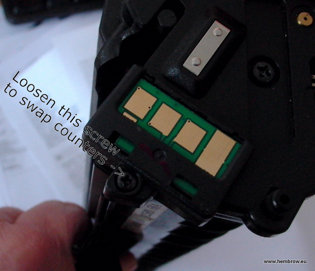 If you remove the single screw which holds the printed circuit board in place then you can swap the counter printed circuit board with that from another cartridge. Always remove the boards from cartridges which have given print problems before they have stopped working with a red flashing light so that you can use these in cartridges which stop with the red flashing light before they are actually out of toner. You will then be able to print with the not yet empty cartridge for as many pages as the counter would still have allowed for the older emptier cartridge.