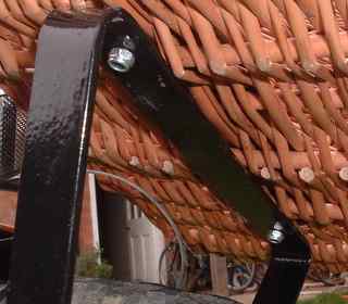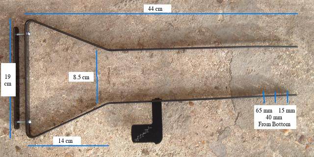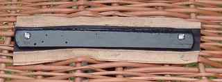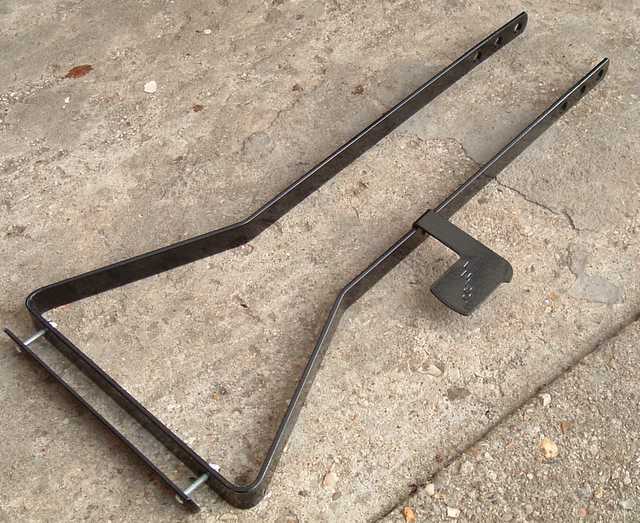 This extra large basket was made for carrying a dog. Because a pet will move around you really need a bracket in order to keep the basket firmly on the bike when the animal moves. ![]() These photos show the bracket front underneath and from inside the basket. I have used a small length of tyre to prevent the bracket from damaging the basket. ![]() It is made of steel which is 19mm wide and 3mm thick. It is unlikely that you will need the old-fashioned lamp fixing on the side, so it can be made by bending and drilling a single piece of steel.
