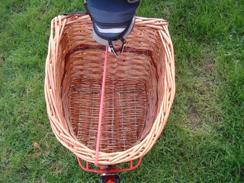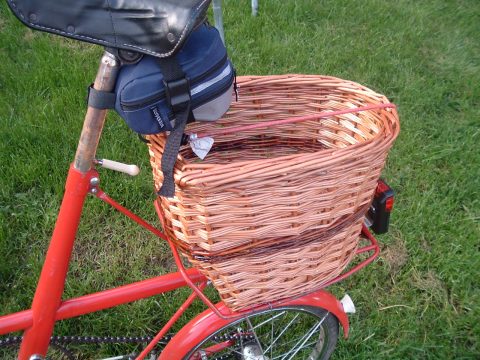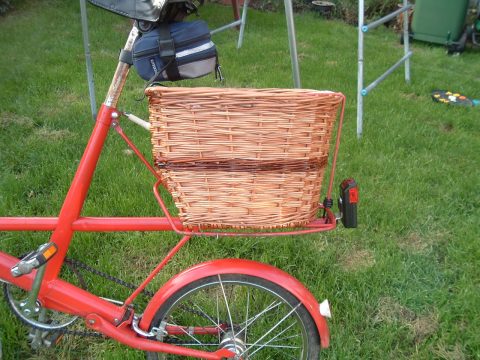 I stopped for a bit, ate my sandwiches, then back again. This time I had to go back up that steep hill, taking maximum advantage of the gears. From Cheveley, I took a different route the rest of the way home (I usually do, just for variety), through Saxon Street, Little Ditton, Woodditton, Stetchworth and Dullingham (crossing the route I took before) then turning towards Westley Waterless before the long (and mostly downhill) road to Six Mile Bottom. This is always fun to ride on, even more so when that South-Easterly is still with you. So, I span out on this bit. I stayed on that road all the way to the A1303 by Stow cum Quay before taking the route through Fen Ditton back into Cambridge. The return journey was quite a bit quicker than the outgoing, and I was back home before 3 o'clock. A few minutes less than 4 hours overall. I had no computer on the bike, but on leaving a previous employer (ACIS) a few years ago, I was given a gadget for measuring distances on maps. This thing claims that I did just over 40km on the way out and just over 35km on the way back. Given the stop for lunch and umpteen stops for map reading, that's an OK speed for me. Dr Moulton's marvellous bike didn't go badly at all. More photos of the bike and basket: ![]() The stripe is in red willow. I liked the idea of trying to make it match the frame, though of course natural colours can't really compete with such a bright primary red. ![]() The basket is shaped to fit the Moulton's unusually shaped rack. ![]() This basket is actually about an inch shorter than it should have been. For customers wanting a similar basket I'll make them the correct length ! The basket comes out as 41 cm long, 32 cm wide and 25 cm high and the price is . The height can be varied if this would be a problem given the height of your saddle. By default, I make baskets entirely of buff willow. I don't charge extra for a stripe of colour, but let me know what you'd like. Sadly I had to sell the Moulton when we moved. However, they're great bikes and I hope that one day I may have another. There are many web sites of interest to Moulton enthusiasts on the web. I'd recommend Moultoneers as a good start. I've also a few links to my cycle touring stories that might be of interest. This website in English Home Winkelmanden, hondenmanden ... Kindermanden Fietsmanden Manden op maat gemaakt Video over mij vlechten Geschiedenis en Informatie Reparaties en reproducties De kleur van de wilgen. Fietsen met mijn fietsmanden Kopen / Contact Informatie |