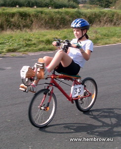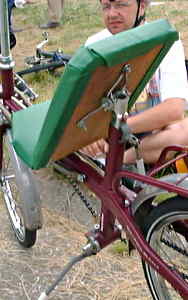 with the small weld used to attach them were donated by a friend.These two photos show the bike at a very early stage. Note the not terribly comfortable "nothing but a plank of wood" seat, which was later fitted with a few layers of camping mat. I rode it first, and found it very easy to ride, then my children both had a go and seemed to get the hang of it straight away with a little reminder of the principles of how a bicycle is balanced. In contrast to the Dutch bike, this version has derailleur gears, which gave a little trouble with chain line and the chain hopping off. I ended up solving that problem by using some plastic tube as used on such as the Flevobike Oke-Ja. ![]() ![]() Eliza raced a few more times, but after a while she was a little large for the bike and it fell into dis-use. It was given to a friend in Cambridge before we moved house. This is perhaps not the most elegant way of making a recumbent bike. However it's very easy to do, and I found that it was rideable even by an adult (i.e. me), if a little too small the way I'd constructed it. It is quite possible that an adult bike can be made in a similar way, but of course what you do is at your own risk ! VideoWe've one video of the bike in action, taken at the Eastway track in Lea Valley, London, on the 8th of May 2004: This was one of my personal favourite tracks in Britain. It had a sharp hairpin and also a couple of hills which made their presence known after a few laps. On this day, I crashed at the hairpin, which ended my chances in the race. Unfortunately it no longer exists, having been demolished to make way for the Olympic Games in London. ![]() Commercial child's recumbentsThere are not many commercial child size recumbent bikes and trikes. One of the nicer models is the Altena Estrellita two wheeled recumbent. This is suitable for riding real distances and is reasonably priced (for a recumbent). I also have some experience with the KMX kart. This offers a lot of fun without much expense. Otherwise, there is the front wheel drive & lean steer 'Banana Bike' as pictured left. Both the KMX Kart and the Banana Bike are recumbent tricycles. Neither of these two seem to be intended for use beyond having fun (not that there's anything wrong with that). There are also plans for a home made trike for sale here. Products for cycling with children