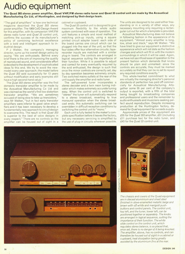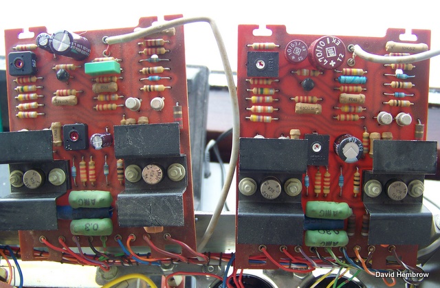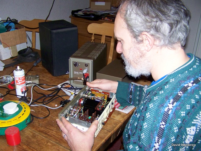 Quad 33 control amplifier, Quad 303 Power amplifierThe Quad 33 / 303 hifi amplifiers are classic designs. Due to being a relatively early transistor power amplifier design, from the 1960s, when high power complimentary PNP transistors were not so easy to find, they were designed to use a "triplet" circuit instead, with all NPN transistors. This pair of amplifiers came to me through family. They were last serviced in 1986, so I had to service them before use. Read further down this page to find out about the restoration. There's also a section about solving problems and one about a modification to improve performance with a separate phono amplifier. Quad's amplifiers were, of course, designed to be used with their own ESL 57 electrostatic speakers, and that's the combination which I use. Quad 33 control amplifier![]() The Quad 33 is a modular pre-amp which offers a range of different facilities. In contrast to many modern hifi components, it has a useful range of tone controls. Not only treble and bass boost and cut but also high frequency filters controllable for frequency and slope which are intended to improve the sound of low quality sources. ![]() The rear of the unit. From left to right, the two radio inputs, tape in/out above the preamp output, tape replay input and earth socket, two mains outputs (for matching tuner and the power amp), mains input, fuse and phono input. Note also the flaps which cover the tape and disc adaptor boards. The preamp doesn't really have enough inputs for modern usage, and the expected signal level is rather low. However, it is very configurable in comparison with modern devices. ![]() The tape adaptor board and the disc adaptor board. Both these boards can be accessed without opening the case. They are pulled out through openings on the back of the preamp. The screw positions on the tape board allow setting the gain of this input to match other sources. The disc (phono) adaptor board can be fitted four different ways around. These give two different gains for moving magnet inputs, a ceramic pickup input (of little use these days) and a straight through input with holes left in the PCB for adding your own components. This can be used to convert the disc input for compact disc. ![]() The insides of the Quad 33. All very logical and designed to be easy to service. On the left you can see the two buffer boards which pull upwards out of the motherboard. On the right is the phono board which is also removeable. The black box in the middle is the transformer, mounted on a board which includes voltage regulation for the rest of the preamp. ![]() The buffer boards and the phono board. High quality plastic capacitors in this 1960s design (and some electrolytics which perhaps are past their best before date). I plan to add more photos, including of the internals of the Quad 33, circuit diagrams, suggested alterations etc. when I have had a chance. Quad 303 power amplifier ![]() The Quad 303 power amp is perhaps the more well known of the two components. Not only does it have the unique "triples" circuit, but it also has a reputation for robustness and is known for sound quality even now. I am very lucky in that this example of the Quad 303 is in perfect condition. Not a scratch on the heatsink grills, for instance, which are often quite tatty on well used 303s. ![]() Internal view of the Quad 303 amplifier. This is also a modular design, with two identical amplifier boards on the left (for left and right channels) and a power supply regulator on the right. It is quite rare for a power amplifier to have a regulated power supply, but this one does. The only problem with my Quad amplifiers as they came to me was their age. Electrolytic capacitors dry out with time, so I felt I couldn't entirely trust the amplifiers, and the switches didn't work perfectly every time. Updating the 33 and 303![]() Unfortunately, the amplifiers languished for over a year until I got around to working on them, between Christmas and New Year 2010. I had originally planned to take the amps apart and work out for myself what parts were required to service them, and to also adjust the gain at the same time so that they'd have better compatibility with modern sources (the output of CD players etc. are a bit "hotter" than older components) but I never got around to it. I started looking about for information and realised that there were kits of parts available which meant I didn't have to duplicate work which had already been done by others. I chose the DaDa Electronics kits as they stay true to the original design of Peter Walker. The kits provide only those parts which must be changed due to age, those which adjusting the gain to cater for CD, and a few which tighten up tolerances and widen the bandwidth of the amp just a little. These are logical changes which I'm sure Quad would have done themselves if they'd carried on producing the amplifier for longer. As well as all the parts required, Dada also sent a link to very good online manuals. I also ordered a small quantity of lead solder from them. It's not a good idea to mix up lead free solder (which I already had) with the lead solder on the original boards and components as this can result in unreliable solder connections. ![]() Older parts gave way to new parts. On the left is an updated 303 amplifier board, while that on the right has not yet been updated. ![]() All the removeable boards from the Quad 33 with replacement parts fitted. While some parts in my amplifiers had a 1969 date stamp on them, my amplifiers had actually been serviced by Quad in 1986 and some parts had been replaced then. However, that's still 24 years ago, so it didn't hurt to replace some things again. ![]() That's me, working on the amps. The switch cleaner rejuvenated the switches, some of which were a bit temperamental. After a few hours work, the Quad gear could take up its rightful place next to the speakers they were designed to match. ![]() And the sound i