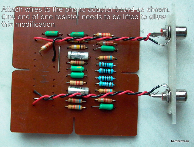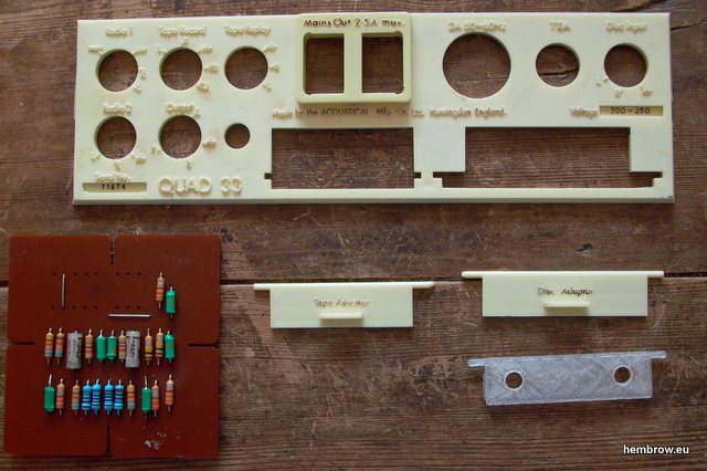 And what do I think of the Quad 33/303 now I'm using them ?It's only been a couple of weeks as I write this, but they sound marvellous. It's much the same story as when I got the ESLs. That ended my desire to swap speakers. I think the same has now happened with amplifiers. Problems which occurred with my Quad 33/303Mostly I've been getting on with enjoying listening the music through the amp. However, there have been a feww problems along the way: One channel sounds dullTwo years after the upgrade, I realised that one channel sounded very dull compared with the other. It was a bit difficult to identify at first because the problem was intermittent. It was not absolutely clear whether the problem was with the pre-amp, power-amp or the speakers. I eventually decided it was definitely the pre-amp by excluding other variables. Resoldering components and cleaning the connectors in the pre-amp seemed not to achieve much so I asked for assistance on the Dada Electronics forum. The reply was about cleaning the selector switches, which I did using a tin of Servisol. This resolved the problem. In retrospect, this should have been obvious. The same problem had occured two years earlier and I'd resolved it in the same way. I would suggest that cleaning the selector, mono/stereo and filter switches should be your first action if you have a channel imbalance or dull sound in one channel with a Quad 33. One way crosstalk in Quad 303It can be difficult to work out where intermittent problems come from, and at one point I convinced myself that the problem with one channel sounding dull came from the power-amp, not the pre-amp. Unfortunately, while I had it apart to take a close look, I accidentally disconnected one of the wires between an amplifier board and a power transistor. On reassembly there was a strange symptom of crosstalk in one direction only (in my case the "<-mon" switch lead to sound in both speakers while "mon->" made sound only in the right speaker) and a high level of distortion in one channel. Reconnecting the wire solved this problem. Phono modificationMy record player is a few metres away from the preamp and this means I have to use long cables to reach the Quad. The capacitance of the long cables resulted in rolled off treble. I own a good quality external phono preamp which fell out of use a few years ago when I got the Quad amp, but it now makes sense to use it again so that I can shorten the low level cables taking the signal from the cartridge to the preamp and send more robust line level signals to the Quad amp. I looked at the circuit diagram for the Quad 33 and it was instantly obvious that it is possible to completely avoid the Quad's phono preamp circuitry simply by rewiring the plug in disc adaptor. I also decided to add phono plugs at the back of the amplifier to allow normal cables to be used, but as I didn't want to drill holes in the back of the amplifier I made a 3D printed replacement disc adaptor cover so that the original could be preserved. See the photos below for more details of this modification. As first constructed Modified with attenuator to prevent clipping on the tape board with the output of my rather "hot" phono preamp The disc adaptor has four sides. The S1 side is used with this modification and the signal is connected to pin 3 (left) and pin 14 (right). Earth connections are found on pins 5 and 12. Pins 1 and 2 are covered with a piece of tape in order to disable the now unneccesary power supply connection to the internal phono preamp. Note that when connected like this, none of the components on the phono adaptor are in circuit. However, everything is retained so that original performance can be restored at any time. After experimentation I installed a few resistors to attenuate the high output of my phono preamp. I found that 22 kOhm in series with the signal and 33 kOhm to ground attenuated the signal enough to prevent clipping in the buffer amplifier within the tape adaptor (all sources are routed through this amplifier). I made this modification in order to use an external phono preamp with the Quad 33. However, after making this modification, any line level source can be used with the "disc" input, for example a CD player. Surprising gain in sound qualityApart from getting back the treble, I didn't expect much of a change from using an external phono preamp rather than the internal one in the Quad 33. However, there is actually another quite dramatic gain: The Quad 33 preamp rolls off the bass from phono sources while my external preamp does not. This actually has a dramatic effect on sound quality. Some people express opinions that the Quad 33 has a pedestrian sound quality. I've never found this to be the case with digital and other line level sources. It now seems to me that this problem is perhaps real, but that it lies entirely within the phono preamp. Use this modification instead of the internal Quad preamp and the problem is solved. Fault finding: Low level high frequency rustling noiseIn mid 2017 I started to hear a strange quiet high frequency "rustling" noise from the hifi. At times it sounded like mistracking when playing a vinyl LP, and of course if I was listening to that source at the time this is precisely what I'd put it down to. It could also sound quite similar to what you might expect from a loose connection, dirty volume control potentiometer or selector switch. For a while it seemed to go away if I turned the pre-amp volume up and down a few times or if I selected each of the inputs in turn. After a while, the noise suddenly became more prevalent so that it was almost always present. At that point it became possible to try more things and it became obvious that the sound continued even if the 303 power amplifier was powered up without its line level connection back to the 33 control amp. i.e. the 33 was innocent, vinyl LPs were innocent and the problem lay in the power amp. All the things I'd been doing to treat the symptom