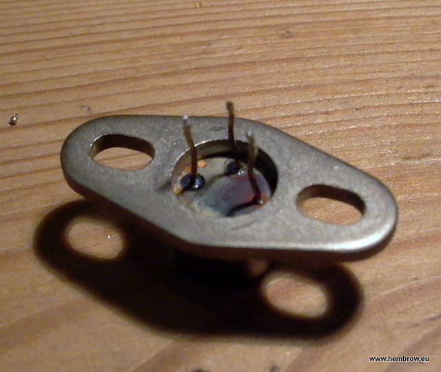 The old transistor is discoloured underneath I plugged in the 303 on its own with the bottom off so that I could compare oscilloscope traces with the rustling sound on a speaker. The rustling was very obvious on a scope trace of the power amplifier output. It also turned out to be easy to see on the regulated output of the 303's power supply. With the amplifier on its side with the PSU board folded open I could probe parts of the PSU and it turned out that TR201, a 38495, worked faultlessly at power up but became less reliable as it warmed up slightly. Tapping on it with a plastic pen caused the scope trace of the power supply line to jump up and down. The voltage was varying between the 67 V which the regulator is supposed to have been set to and a voltage much closer to the input unregulated voltage. It's possible that when people report that they can't achieve the correct PSU output voltage with any adjustment on other Quad 303 amps that the fault is this transistor. After a bit of searching on the internet I found that the BC441 is a good substitute for the original transistor, but my local electronics shop in Assen didn't have one of those so I bought a 2N3553 instead as from their stock it had the most important features of a similar C-E voltage range and could handle a few watts. In both of these regards it's a less good choice than the BC441, but it would be adequate. In practice the C-E voltage across TR201 is usually only about 12 V anyway. The high frequency performance of the 2N3553 is irrelevent in this application. Apart from the text on the top of the transistor it looks identical to the old While the package of the new transistor is not the same as the old and doesn't form such a good connection with the heat sink, the heatsink does serve to hold the transistor quite firmly. I found this transistor not to become very warm anyway so I am leaving it as it is for now. If the transistor fails then I'll replace it with a new one with the correct heatsink for that package. Make a donationSeveral people have asked me if they can make a donation as a way of saying thank-you for help with repairs. I very much appreciate this. If you have repaired your Quad amplifier with help from this page and you you wish to make a donation of €5 then you can do so by clicking on the button below: Other ways to think us are simply to link to this page, which will help others to find this information should they be looking for it, or to link to our webshop. Quad resourcesVarious Quad 33 / 303 related web pages that I have found useful: DaDa Electronics - supplier of the upgrade kits that I used. Quad Spot - Dada Electronics blog.Quad World Quad Musikwiedergabe Sheldon Stokes - has lots of information about the ESLs. Richard Brice on modifying the Quad 33 in particular to be compatible with modern hifi components. Net Audio do quite extensive upgrades of Quad equipment. Jim Lesurf on 303 and 57 interaction Peter Walker's articles on electrostatic speaker design I've more hifi component reviews on my hifi page. Link back to my home page