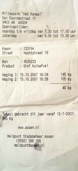 Even a visit to the dump (which I've travelled to by Xtracycle with old carpets from our house) is interesting. You have to take along a Milieupas card (Environment pass) and you're weighed on arrival and on leaving. At the weigh-out station you're presented with a receipt so that charges for waste can be calculated. I know we've some allowance on our card, but I don't know how much this is.