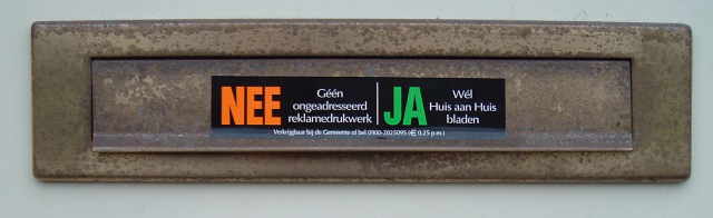 I referred to us having a full sized wheelie bin just for papers and cardboard. We were initially surprised by this, but then the junk mail started arriving. Much more of it than we got in the UK. There is a way to stop it. Just add a sticker to your letterbox as shown in the photo. Ours reads "Nee" to unaddressed advertising mail, but "Ja" to house to house delivery of free newspapers. We've not had one piece of advertising junk mail arrive since attaching this to our letterbox.