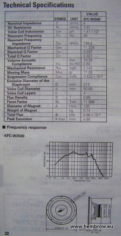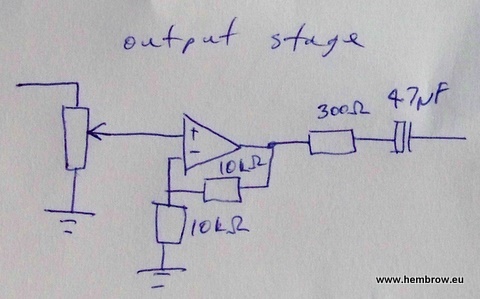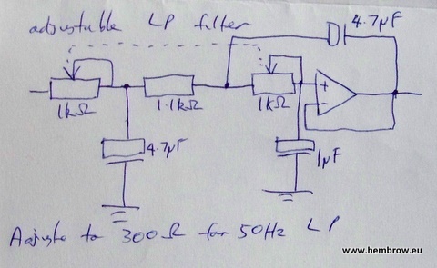 Home-made subwooferI like my Quad ESL speakers a lot. They've a very accurate and natural sound, but they've one limitation. Bass stops at about 50 Hz so the fundamental frequencies of the lowest bass notes and of bass drums isn't reproduced. This is the reason why I've experimented with a subwoofer to provide the missing bottom octave. The driver and boxMy subwoofer is on its second iteration. The box remains the same, the driver remains the same, but the electronics have changed. The driver is not exotic. It's a 10 inch Kenwood KFC-W2500 sold as a car audio driver back in the early 1990s. I originally built the subwoofer as a vented box tuned to reinforce the output of the driver itself with a resonance around 30 Hz and electronic equalization at about the same frequency which resulted in a reasonably flat response in a 42 litre box. However, I was never entirely happy with the sound of the ported box, which could be a bit "boomy". The purpose of the recent redesign was to achieve better performance at the lowest possible cost. That's why it uses the same driver in the same box, a convenient size as a coffee table. However, I have now closed the port as it seemed likely that a closed box or "infinite baffle" design would achieve a flatter in room response. This of course meant that the electronic equalization had to change to suit the modified box because there is no longer any reinforcement from the port resonance. It also means a compromise in that the driver will have to be driven harder at the lowest frequencies. A single ten inch driver may not sound like much, but some commercial "subwoofers" use smaller drivers in smaller boxes. And in any case I don't listen to music at a ridiculous level and my intention all along was to place the subwoofer in the corner of the room so that it benefits as much as possible from room gain. For me this isn't a big deal. On its own, the 42 litre box is not optimal for the driver working as a closed box. This combination results in a resonance of around 46 Hz though the -3 dB is at 64 Hz. Both of these are rather high for a "subwoofer" and the speaker couldn't be expected to reproduce much low bass unless assisted in some way. Luckily others have been here before and help is at hand. the "Linkwitz transform circuit design calculator" spreadsheet calculates values to plug into a simple op-amp based equalizer circuit for any given combination of box and driver. I used it to design a shelving filter for flat response to 20 Hz with my box and driver. Kenwood quotes an Fs of 28 Hz, Qts of 0.327 and Vas of 74.25 l for my driver. Plugging these figures into the spreadsheet together with my box volume of 42 litres results in the graph shown. The blue line is the frequency response for the subwoofer without equalization, the red is the response of the equalization and the green is the expected result of the equalizer and subwoofer working together. The maximum boost of 15 dB is applied only at the very lowest frequencies of interest, where there is little recorded information in music. As such, this won't stress the driver as much as you might imagine. The rest of the circuitryMy equalizer is built around two 25 year old LM833 dual op-amps which I happened to have hanging around. However, almost any op-amps would do. The frequencies of interest are very low, after all, so you don't need something exotic which can cope with high slew rates. The NE5532 is easily overkill and actually you could build it using one LM324 quad op-amp. I've sketched out the circuitry below using my usual "CAD" tool. Each part connects through to the next: Power supplyThe power supply for this circuit is very simple in design. A plug in switched mode supply rated at 12 V and 200 mA was the starting point. It provides enough power and enough voltage for this circuit. Following it is the circuitry shown on the right, using two capacitors in series, paralleled with resistors and LEDs to create an artificial "ground" between two rails at +6 V and -6 V. This only works if the plug in power supply is completely isolated. If the "0 V" rail from the power supply is connected to the real earth or to the 0 V of your circuitry then the -6 V supply is shorted out. The LEDs are optional and provided here only to provide a power on light. While testing, having two of them makes it obvious if you've shorted out one rail of the power supply. The circuitry above and below the artifical ground should be identical as otherwise a DC offset will be created. Note that both of the op-amp chips also have local capacitors between their +ve and -ve supply rails. Input circuitThe stereo input from the pre-amp connects through two 4.7 uF capacitors (to block possible DC offsets) through 66 k ohm resistors (a simple mixer) and is tied to ground by a 150 k ohm resistor to avoid DC offset. The values are not very critical, but they should be relatively high in order that the high pass filter that they create is at a very low frequency which doesn't affect the subwoofer response. It may seem un-necessary to have these capacitors, but without them there is a risk of DC voltages being propagated through the circuitry. The two 10 k ohm resistors result in this op-amp having a gain of 2. This means that the following circuitry can operate on higher voltages, leading to lower noise. Not shown is a very low value capacitor (0.01uF) connected between the -ve and output pins of the op-amp to remove the chance of high frequency resonance. Adjustable low-pass filterThe adjustable low pass filter is built around a stereo 1 k ohm potentiometer which is connected to a knob on the front panel. This allows adjustment of the low pass filter frequency. The initial circuit came from an online tool for 3rd order Sallen-Key filter design. I selected the Bessel filter (for maximally flat group delay and hopefully better integration with my main speakers), a low pass frequency of 50 Hz and gave values of 4.7 uF for the two capacitors.
