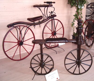 walking machines ("loopmachine" in Dutch).The smaller one to the front is a child's size machine ("kinder loopmachine") made in Germany in 1820. The larger of the two is labelled "Dandyhorse used by the first earl of Durham about 1810". Hanging