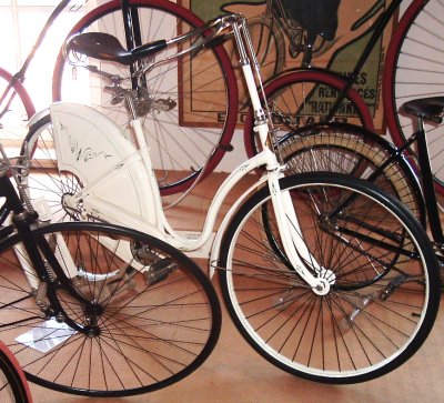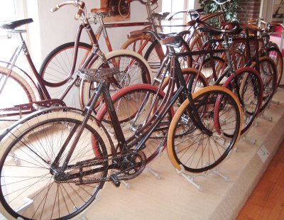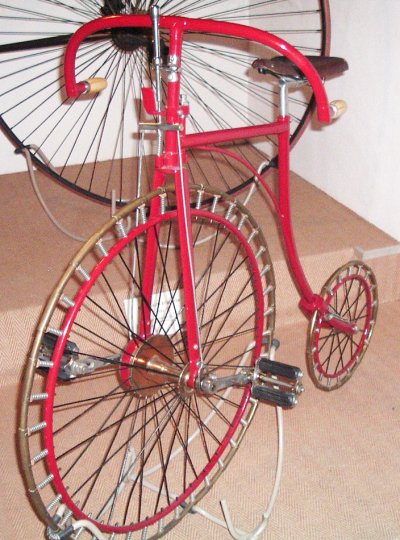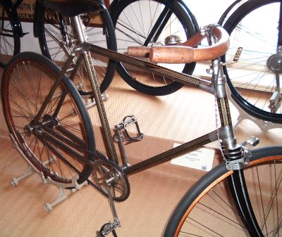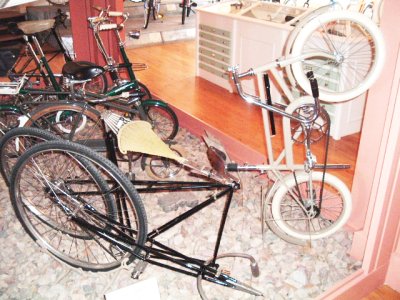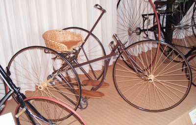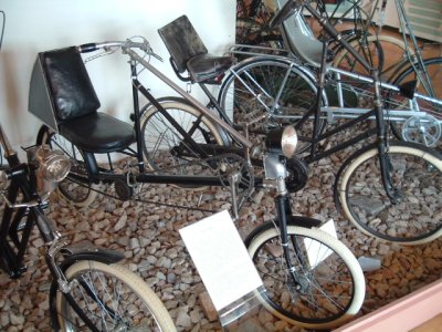 in Nijmegen, The Netherlands, is the largest cycling museum in the country where people cycle more than in any other.We visited the museum in August 2005 when a friend of ours in the Netherlands took us there to see their collection of bikes. The photos will give a taste of what's at the museum, but I recommend a visit. There are many more bikes than you'll see here, and you'll get a much better view of them. Also, there is a nice cafe in the museum and when we were there they were playing a very amusing video demonstrating such things as the better safety of the "safety bicycle" by showing a guy repeatedly falling off penny farthings (or ordinaries if you prefer). A link to the museum's own website is below. Two