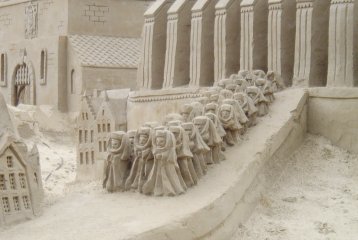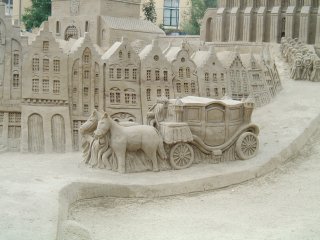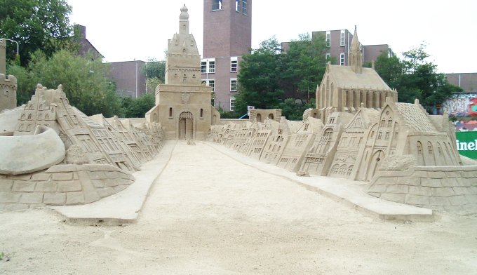 Nijmegen.This is a four day cycling event held annually in which thousands of cyclists go for various organised rides. It's not a race. Lots of people of all ages take part, mostly dressed in quite normal clothing. As you'll see from the posters, rides vary in length so that there is something to suit everyone. Perhaps the closest event to this that I've experienced in the UK is the type of holiday held by the Company of Cyclists, but a fietsvierdaagse can attract thousands of people. Tuesday had rides to the Betuwe, a nearby province of the Netherlands, Wednesday involved riding to Germany etc. Lots of these four day events are held in many places in the Netherlands (search for fietsvierdaagse and note that not all events are four day, or named in this way, so those won't appear) and it's just yet another of those things for cyclists that happen all the time in the Netherlands but which don't have an equivalent in the UK. Since relocating to the Netherlands, we've taken part in the largest Fietsvierdaagse, that in Drenthe. We're now organising our own series of cycling holidays in the Netherlands which are aimed at English speaking people. Another thing that impressed us in Nijmegen had absolutely nothing to do with cycling: ![]() There was a giant sand sculpture in the town. I was assured that this was made only of sand, yet that it had stood in this position for months with an amazing degree of detail on the figures and buildings. ![]() ![]() I've a number of other cycling articles including tour stories and bike reviews including the following: Description of a trip to the Netherlands to a racing event.A family holiday in the Netherlands. A cycle tour of Lincolnshire. Pictures of old English Tradesmans's bikes. You may also be interested in photos of some of my customer's bikes, which include restorations of old bikes with replica baskets. Or perhaps you're interested in the range of standard bicycle baskets that I offer. ![]() |