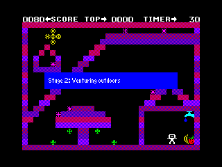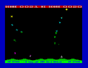 By the time I wrote this I had expanded my personal Spectrum to 48 K of RAM. However the game still runs on a 16 K machine. This time the sound is similar but the objects on screen move pixel by pixel. I tried to get so many moving objects on screen as possible and I can't think of any other Spectrum game which animates so many objects at once as this one does. Mostly they're animated at 50 Hz, but slowdown can occur if the load becomes too high.