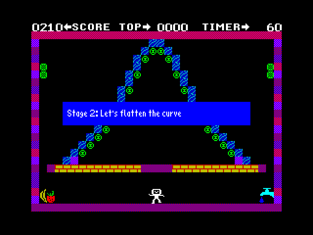 This game involves eating healthily and washing away viruses. There are 12 different screens and while some viruses are easy to destroy, others are stronger and more aggressive. Controls are either the usual QAOP and space to pour disinfectant (actually all of the right bottom row) or Interface 2 joystick one. It should also work with a Kempston joystick if you turn that option on, but I've not been able to test this. It's nothing too special but it'll pass the time. While the tap file is less than 9 kb in size, you need a 48K spectrum for this game.