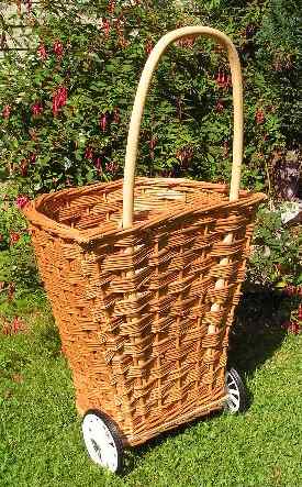 David HembrowTraditional English Willow basketmaker. Assen, NetherlandsWheelie shopping basketWheeled shopping baskets can be very useful for taking more shopping with you than you want to carry.This is the one type of basket on this web site which I don't make. These were made by my father, Gordon Hembrow, in Somerset before he passed away in March 2009. The remaining few of these baskets have now been sold, and there are no more. Two sizes were available, both referring to the height of the basket itself, not including the handle. These heights could be 16" or 20". The handles are approximately 36" from the ground. The photos are both of the same 20" tall basket.